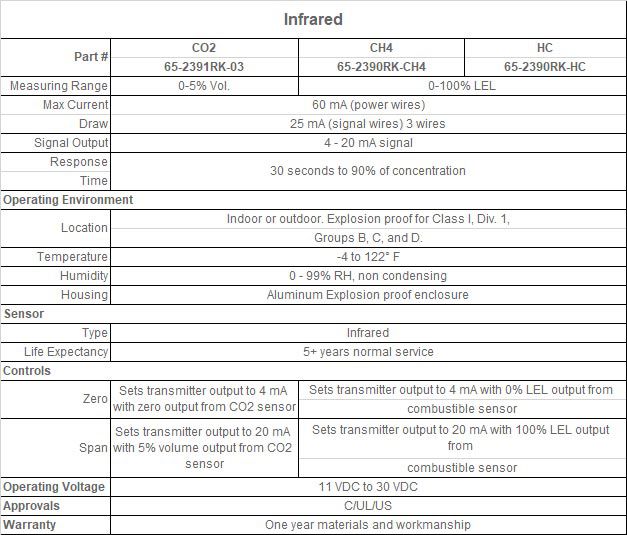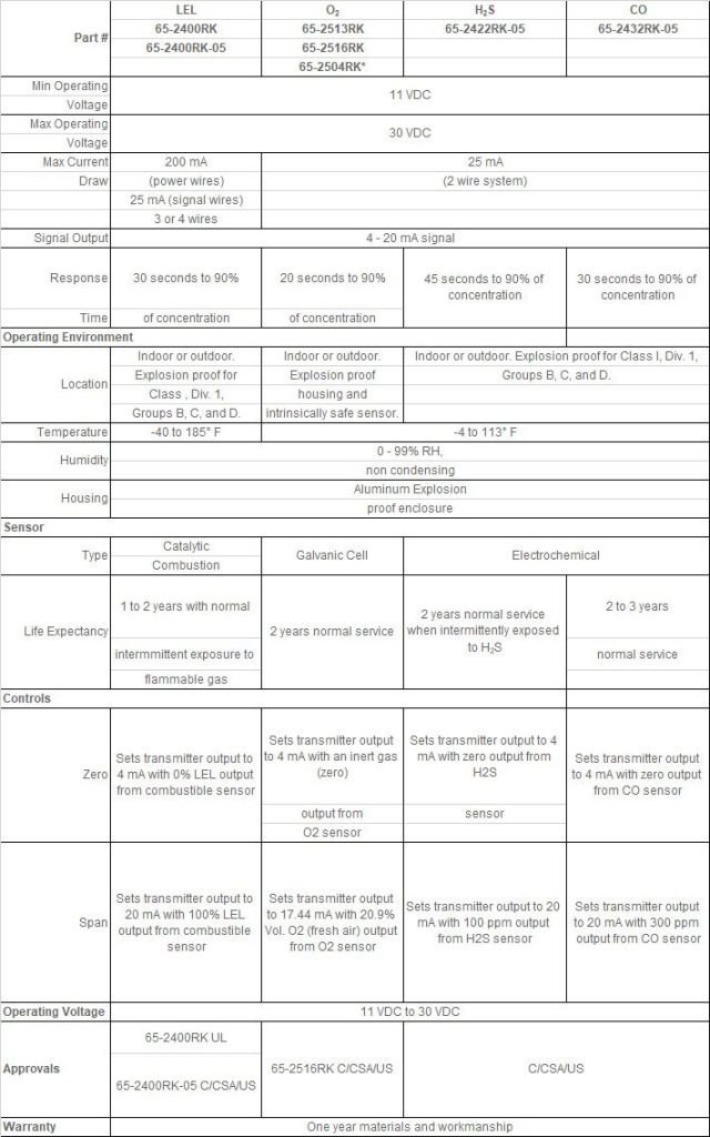 The RKI S series gas sensor/transmitters are highly reliable and cost effective basic 4-20 mA transmitters for the detection of common gas hazards. The S series transmitters are available for LEL (catalytic), LEL (IR) CH4, LEL (IR) HC, O2, H2S, CO, or CO2 (IR). The electronics are encased inside a potted package to avoid damage from mechanical abuse or corrosion, and this assembly is installed inside an explosion-proof enclosure. All sensors are explosion-proof with flame arrestors and approved for use in hazardous atmospheres. There is also an optional version for oxygen for use in non-hazardous atmospheres.